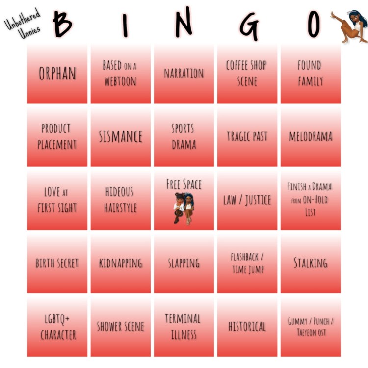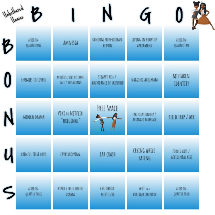 Below are three cards: Lazy Unnie’s bingo card, Sugar Baby Unnie’s and a Bonus bingo card. As we explore the world of Asian dramas this year, we will be playing bingo. If you’re not familiar with the rules of bingo, well then Google is free… For our rules, we will be watching various dramas throughout the year (not limited to 2020 dramas) and then picking one drama per block on our bingo card. We will be trying to achieve bingo in the traditional way of horizontal, vertical or diagonal. We each have our own bingo card and once we have achieved bingo then we will subsequently try the other’s card and then lastly the bonus. card If we manage to hit traditional bingo on all three cards before year’s end then we may get a little spicy and shoot for a full house bingo!