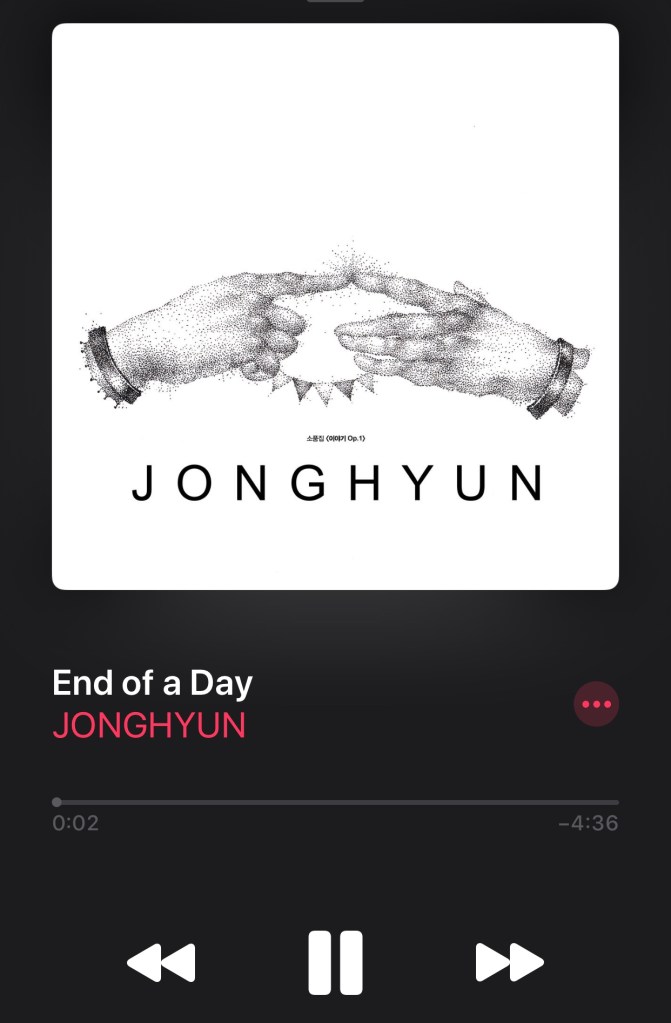 - End of a Day by Jonghyun – I miss him. I miss everything about him and I’m so upset I wasn’t into K-Pop earlier so I had the chance to bask in his greatness. This song is one of my favorite ballads and doesn’t fail to make me tear up. Jonghyun’s falsetto is… *chef’s kiss*